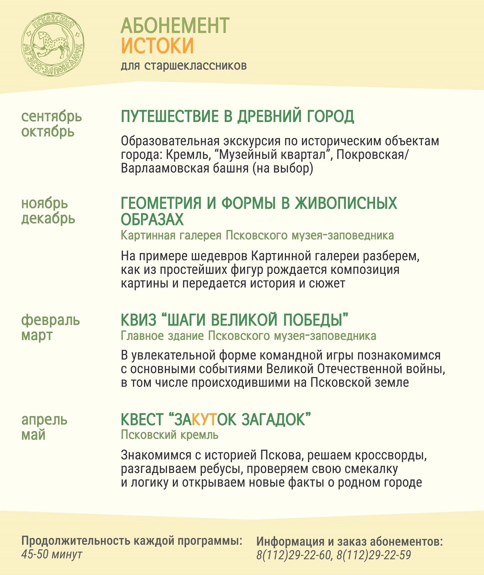 Культурно-образовательная программа для старшеклассников «Истоки» содержит в себе занятия на серьезные и увлекательные темы по истории и культуре. Она позволит ребятам ближе познакомиться с некоторыми культурными явлениями и глубже погрузиться в историческое прошлое родного города и страны.