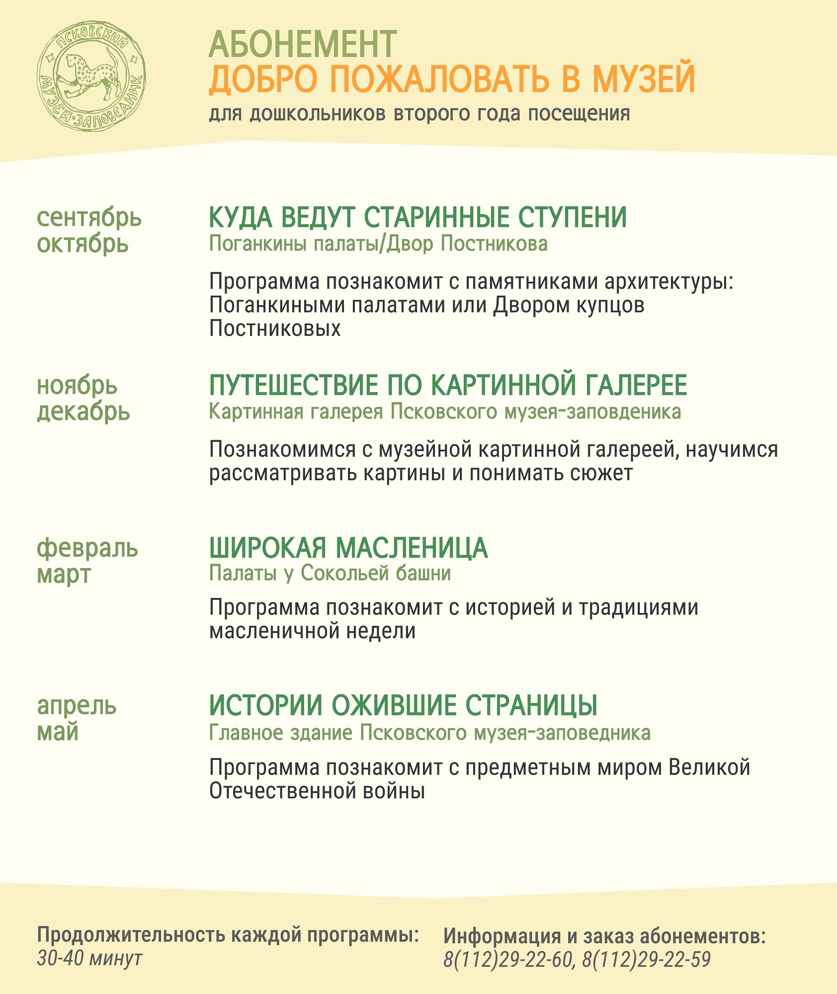 Дошкольники могут организованно, в доступной форме познакомиться с историей родного города с помощью наших абонементов. Для впервые посещающих музей абонемент «Добро пожаловать в музей». Для школьников, желающих больше узнать об истории православия предусмотрен абонемент «Азы православной культуры».