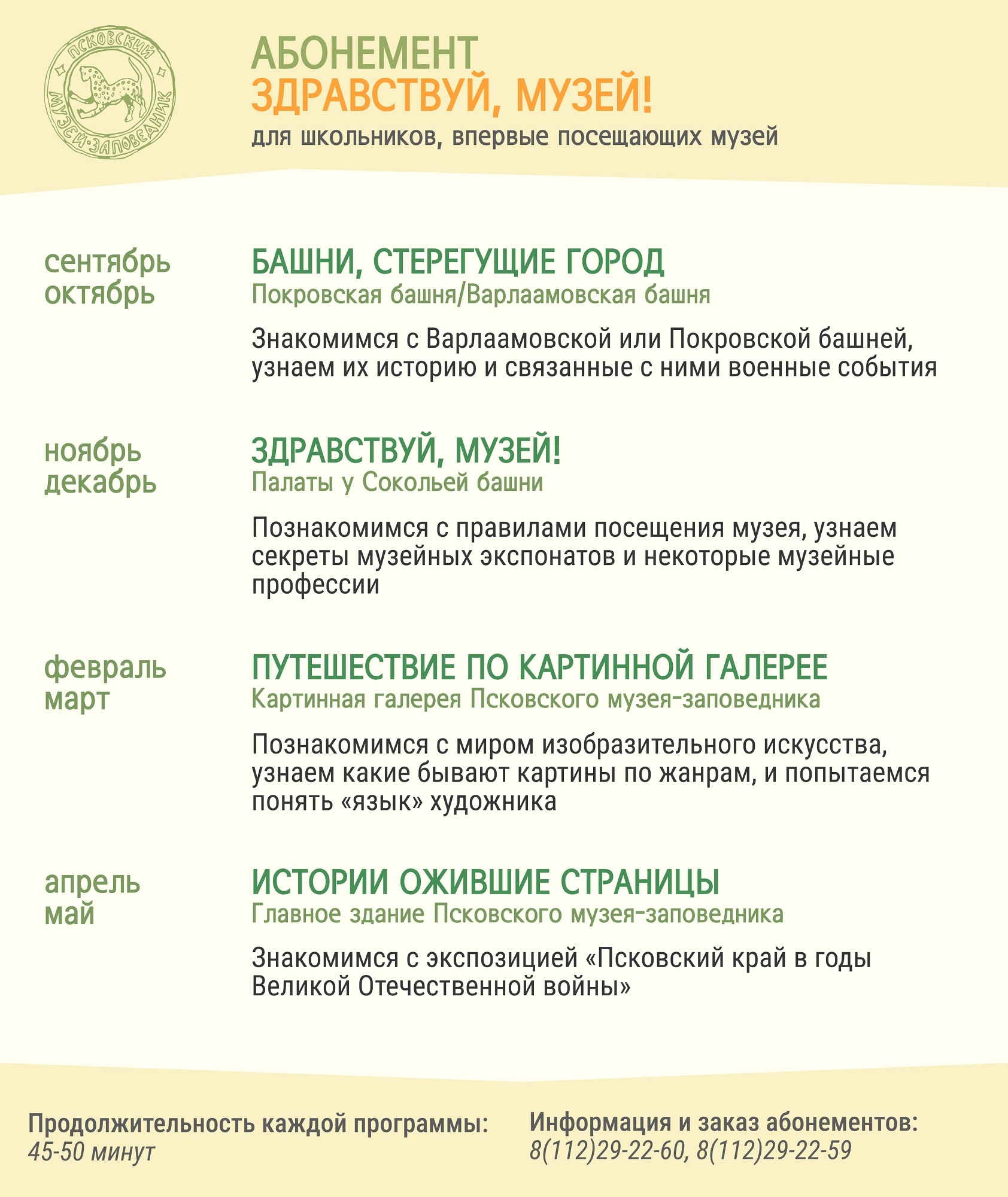 Детский музейный центр предлагает учителям и родителям абонементы для дошкольников, школьников и старшеклассников. Наши образовательные программы включают в себя занятия, дополняющие школьную программу, первое знакомство с городом и музеем, прогулки по городу, а также углубленные знания по истории родного края.